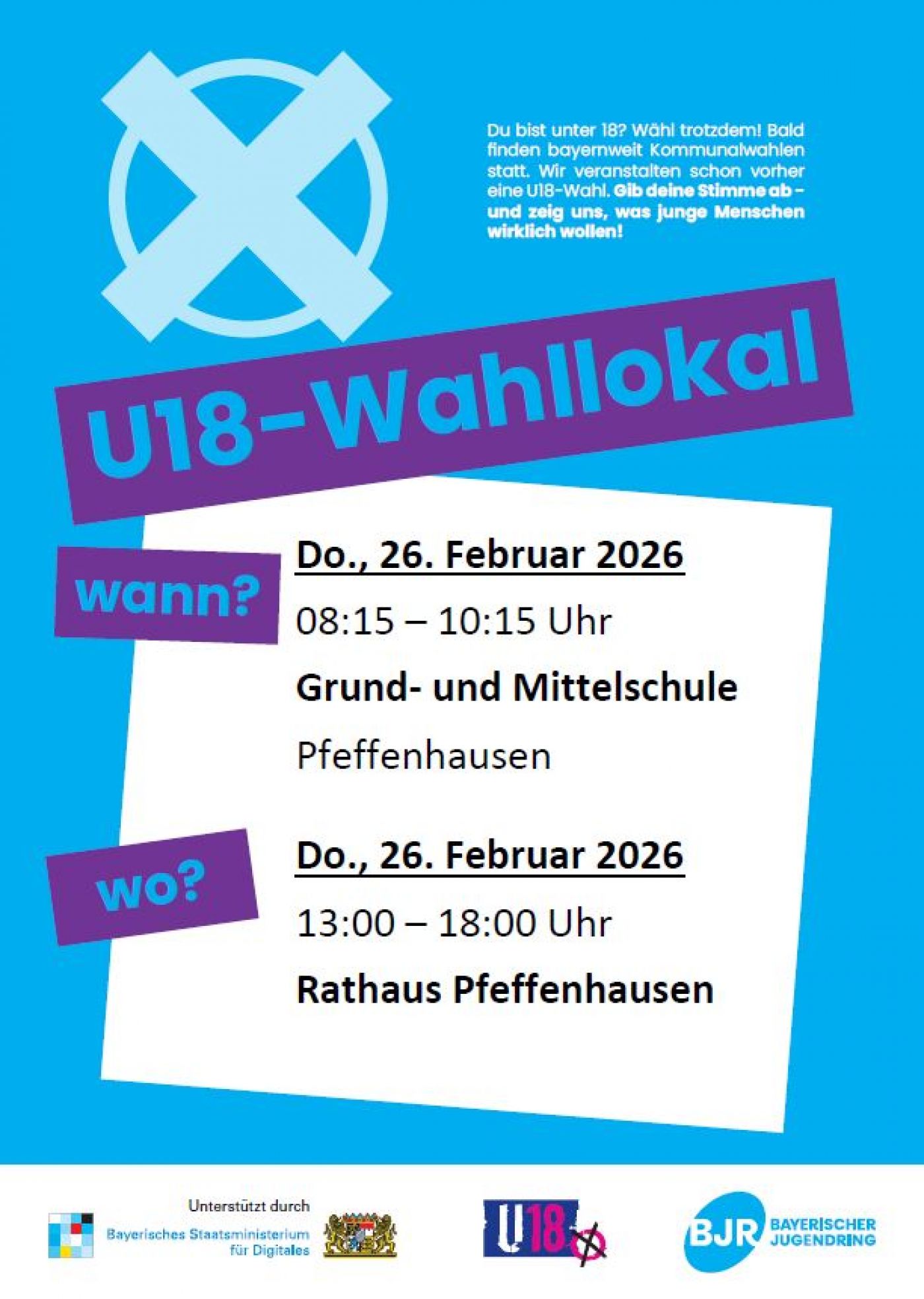 Wählen dürfen alle Kinder und Jugendlichen, die noch nicht volljährig sind und in Deutschland leben. Die Ergebnisse aller Wahllokale werden unter www.u18-landshut.de bekanntgegeben. Die U18-Wahl in der Region Landshut wird vom Kreisjugendring Landshut mit seinen Kooperationspartnern seit mehreren Jahren organisiert. In Pfeffenhausen wird die Wahl in Kooperation mit dem Markt Pfeffenhausen und den Jugendbeauftragten des Gemeinderats durchgeführt.
